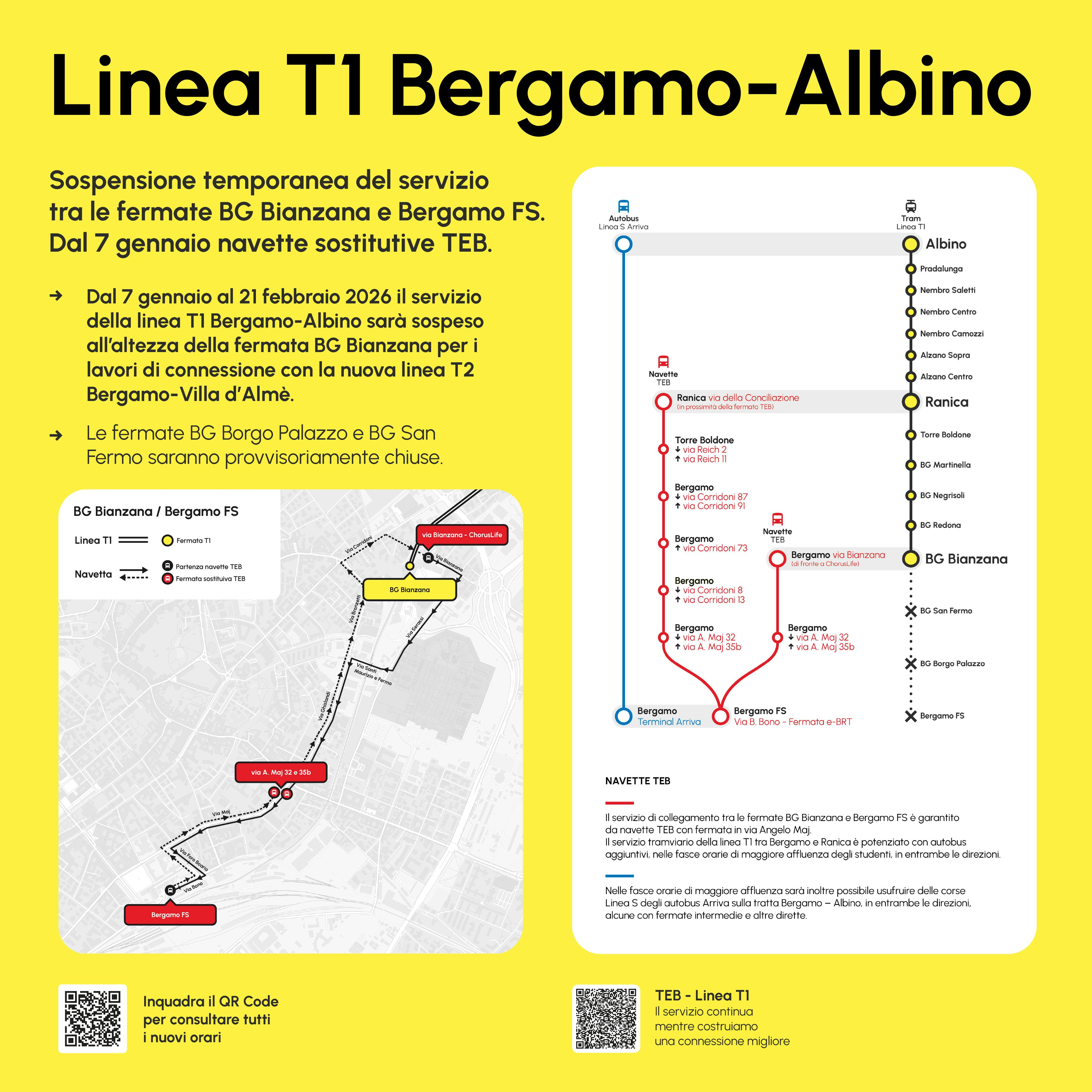 Per garantire la mobilità dei passeggeri della linea T1, fino al 21 febbraio 2026 sarà attivato un servizio sostitutivo di autobus tra le fermate tramviarie BG Bianzana e Bergamo FS.