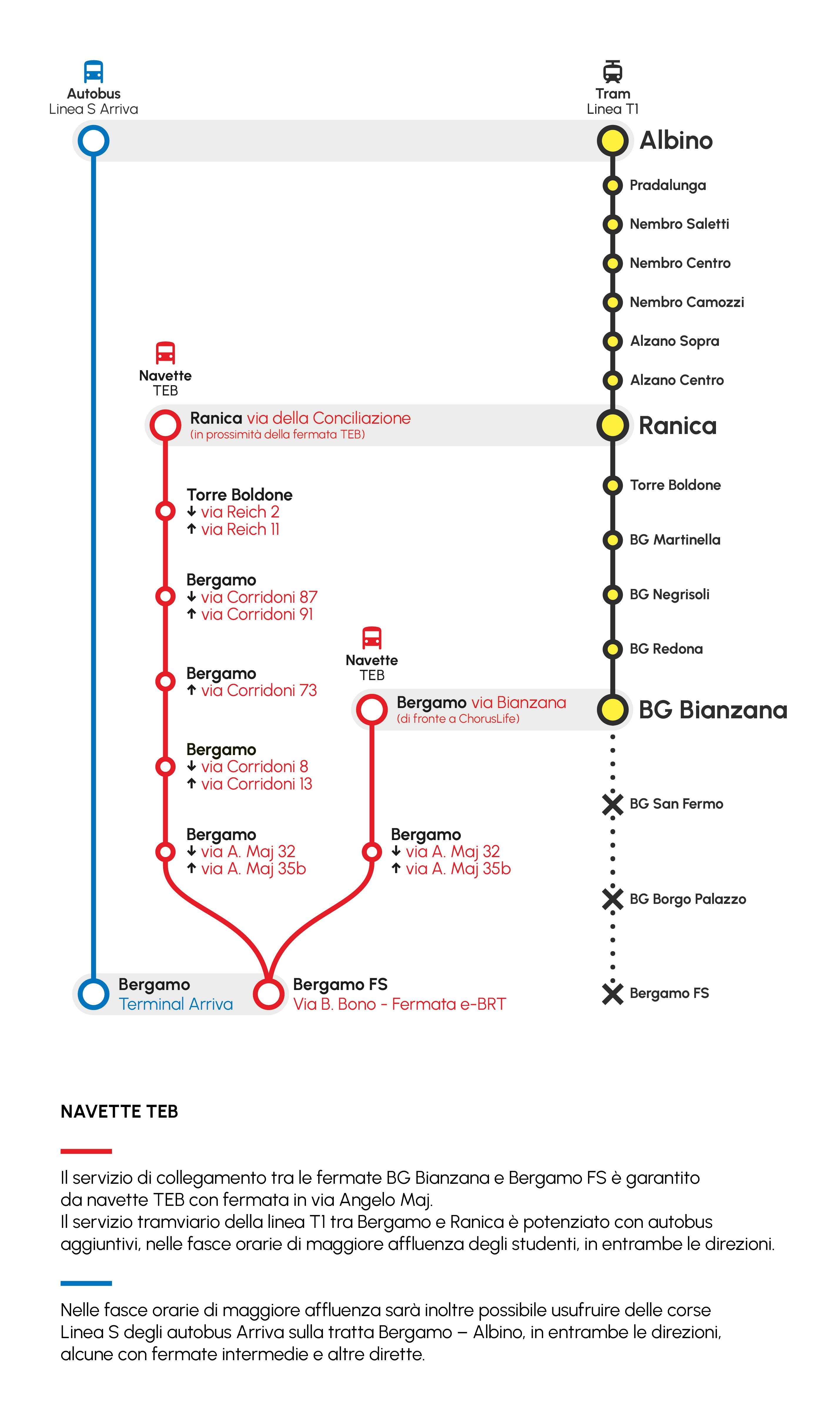 I passeggeri dei tram provenienti da Albino con direzione Bergamo FS, dovranno scendere alla fermata BG Bianzana e proseguire il viaggio sugli autobus in partenza dalla fermata provvisoria in via Bianzana, di fronte a Chorus Life. Le navette percorreranno via Serassi, svolteranno in via Santi Maurizio e Fermo, continuando in via Ghislandi, via Angelo Maj e successivamente in via Foro Boario, fino alla fermata provvisoria Bergamo FS in via Bartolomeo Bono (capolinea e-BRT).